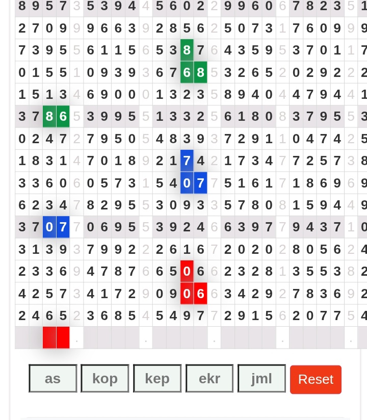 | Rumus Angka Mati berdasarkan kepala harian | 04 05 06 07 08 09 10 15 16 17 18 19 21 26 27 28 29 30 32 37 39 41 42 43 52 53 54 63 64 65 75 76 83 84 86 87 94 95 97 |