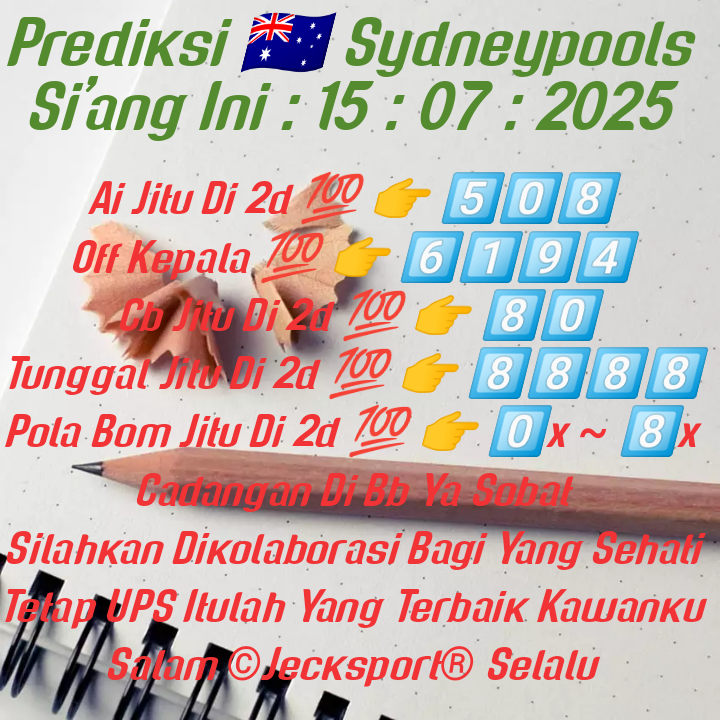 Prediksi Sydneypools Sabtu, 10-01-2026 Merupakan Prediksi Otomatis yang menggabungkan Metode Kalender Togel Dengan LN Generator yang akurasi prediksinya sudah kita ketahui bersama. Jadi harap Maklum Jika kadang meleset Prediksi Sydneypools kita. Jadikan ini sebagai perbandingan saja dan tetap Utamakan karya sendiri