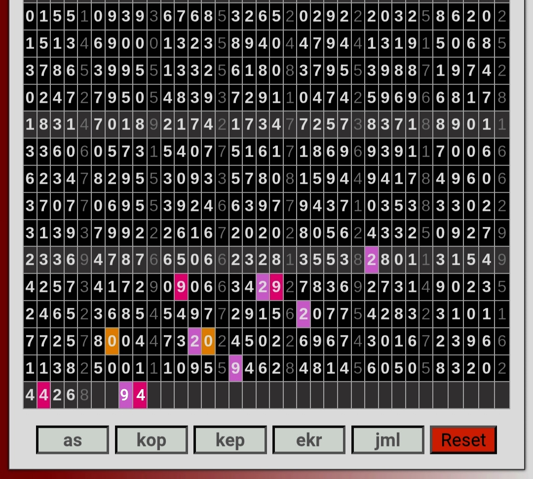 | Rumus Angka Mati berdasarkan kepala harian | 04 05 06 07 08 09 10 15 16 17 18 21 26 28 29 30 31 32 41 42 43 52 53 54 64 65 72 73 75 76 83 84 86 93 94 95 96 97 98 |