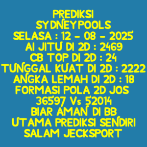 Prediksi Sydneypools Kamis, 15-01-2026 Merupakan Prediksi Otomatis yang menggabungkan Metode Kalender Togel Dengan LN Generator yang akurasi prediksinya sudah kita ketahui bersama. Jadi harap Maklum Jika kadang meleset Prediksi Sydneypools kita. Jadikan ini sebagai perbandingan saja dan tetap Utamakan karya sendiri