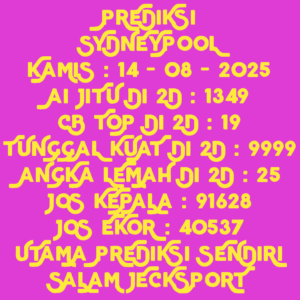 Prediksi Sydneypools Kamis, 15-01-2026 Merupakan Prediksi Otomatis yang menggabungkan Metode Kalender Togel Dengan LN Generator yang akurasi prediksinya sudah kita ketahui bersama. Jadi harap Maklum Jika kadang meleset Prediksi Sydneypools kita. Jadikan ini sebagai perbandingan saja dan tetap Utamakan karya sendiri