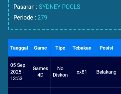Selamat Bergabung kembali bersama angkanet dalam room Prediksi Sydneypools. Untuk kenyamanan dalam berprediksi, kami melarang adanya posting nomor WA, Web atau FB. Angkanet juga tidak pernah menjual prediksi, software, atau aplikasi togel lainnya. Berprediksilah secara damai dan elegan. Terima kasih telah menjadi pengunjung setia angkanet