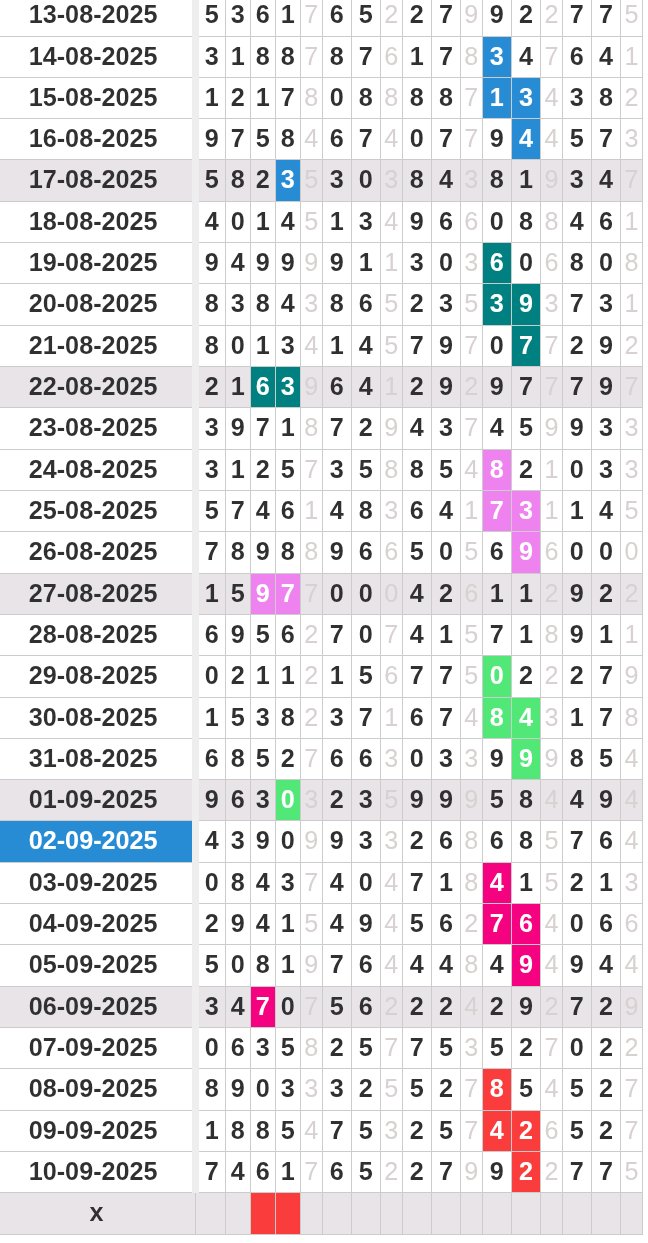 | Rumus Angka Mati berdasarkan kepala harian | 05 06 08 09 16 17 19 20 21 26 27 28 29 30 31 32 37 38 39 40 41 43 48 49 51 52 54 59 63 64 65 74 75 76 85 86 87 97 98 |