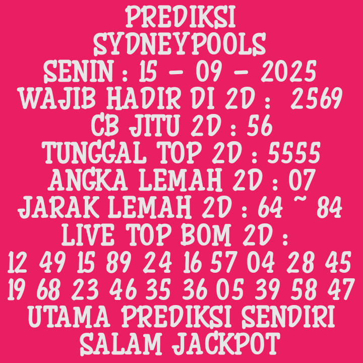 Prediksi Sydneypools Sabtu, 20-12-2025 Merupakan Prediksi Otomatis yang menggabungkan Metode Kalender Togel Dengan LN Generator yang akurasi prediksinya sudah kita ketahui bersama. Jadi harap Maklum Jika kadang meleset Prediksi Sydneypools kita. Jadikan ini sebagai perbandingan saja dan tetap Utamakan karya sendiri