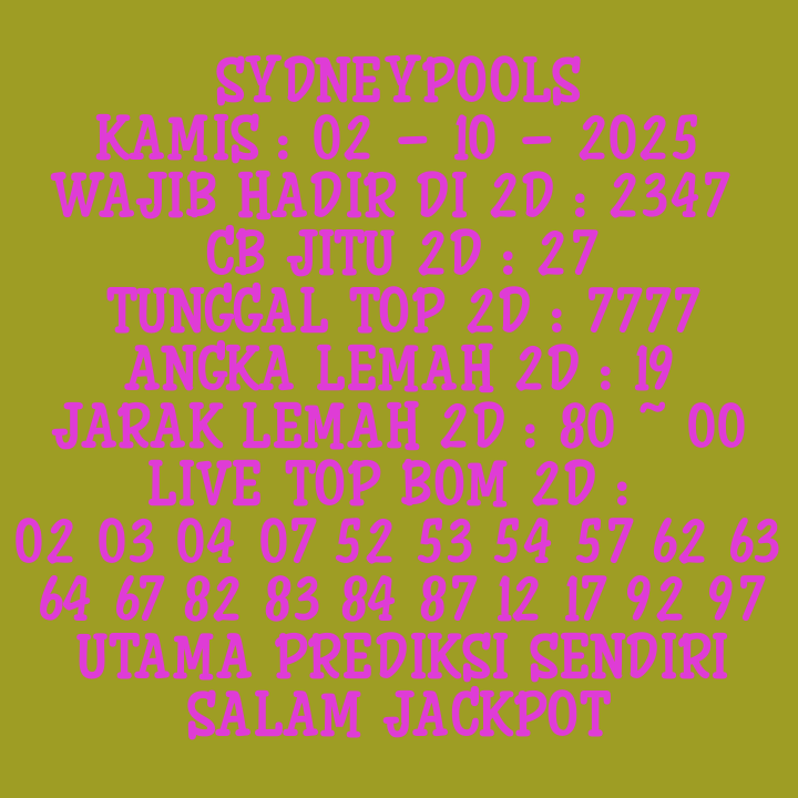Prediksi Sydneypools Minggu, 18-01-2026 Merupakan Prediksi Otomatis yang menggabungkan Metode Kalender Togel Dengan LN Generator yang akurasi prediksinya sudah kita ketahui bersama. Jadi harap Maklum Jika kadang meleset Prediksi Sydneypools kita. Jadikan ini sebagai perbandingan saja dan tetap Utamakan karya sendiri