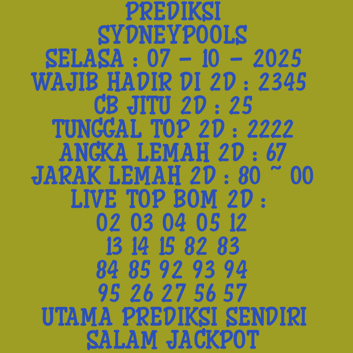 Prediksi Sydneypools Sabtu, 17-01-2026 Merupakan Prediksi Otomatis yang menggabungkan Metode Kalender Togel Dengan LN Generator yang akurasi prediksinya sudah kita ketahui bersama. Jadi harap Maklum Jika kadang meleset Prediksi Sydneypools kita. Jadikan ini sebagai perbandingan saja dan tetap Utamakan karya sendiri