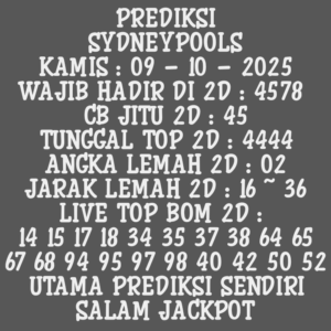 Prediksi Sydneypools Selasa, 20-01-2026 Merupakan Prediksi Otomatis yang menggabungkan Metode Kalender Togel Dengan LN Generator yang akurasi prediksinya sudah kita ketahui bersama. Jadi harap Maklum Jika kadang meleset Prediksi Sydneypools kita. Jadikan ini sebagai perbandingan saja dan tetap Utamakan karya sendiri