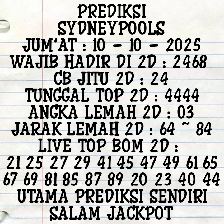 Prediksi Sydneypools Rabu, 14-01-2026 Merupakan Prediksi Otomatis yang menggabungkan Metode Kalender Togel Dengan LN Generator yang akurasi prediksinya sudah kita ketahui bersama. Jadi harap Maklum Jika kadang meleset Prediksi Sydneypools kita. Jadikan ini sebagai perbandingan saja dan tetap Utamakan karya sendiri
