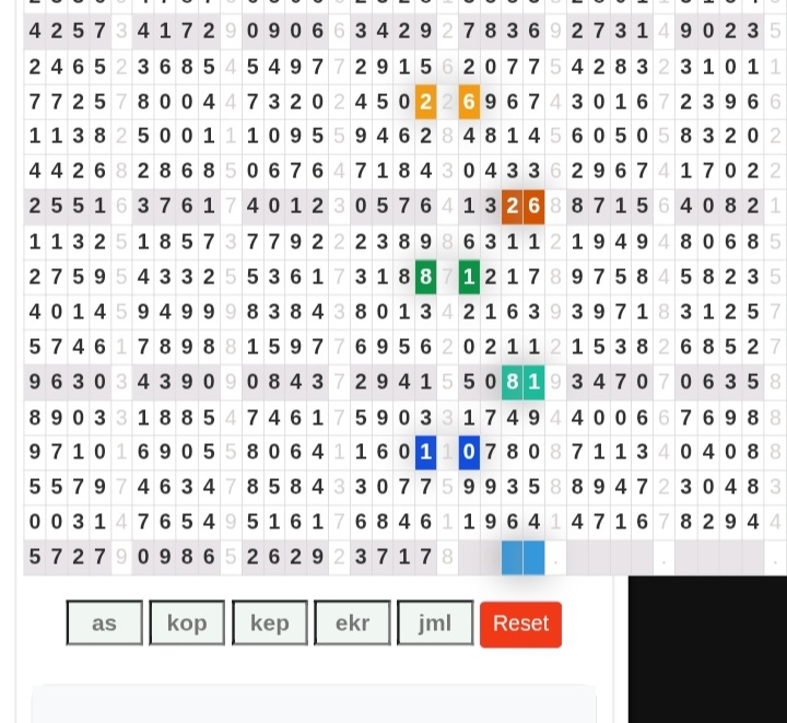 | Rumus Angka Mati berdasarkan kepala harian | 04 05 06 07 08 09 10 15 16 17 18 21 26 28 29 30 31 32 41 42 43 52 53 54 64 65 72 73 75 76 83 84 86 93 94 95 96 97 98 |