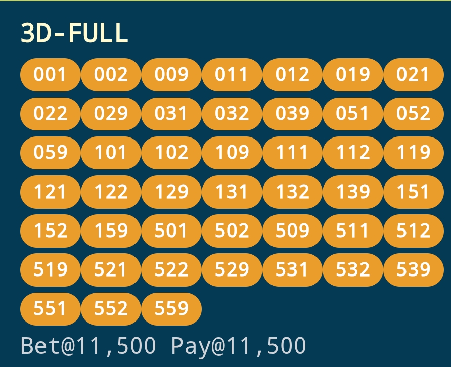 | Rumus Angka Mati berdasarkan kepala harian | 04 05 06 07 08 09 10 15 16 17 18 21 26 28 29 30 31 32 41 42 43 52 53 54 64 65 72 73 75 76 83 84 86 93 94 95 96 97 98 |