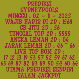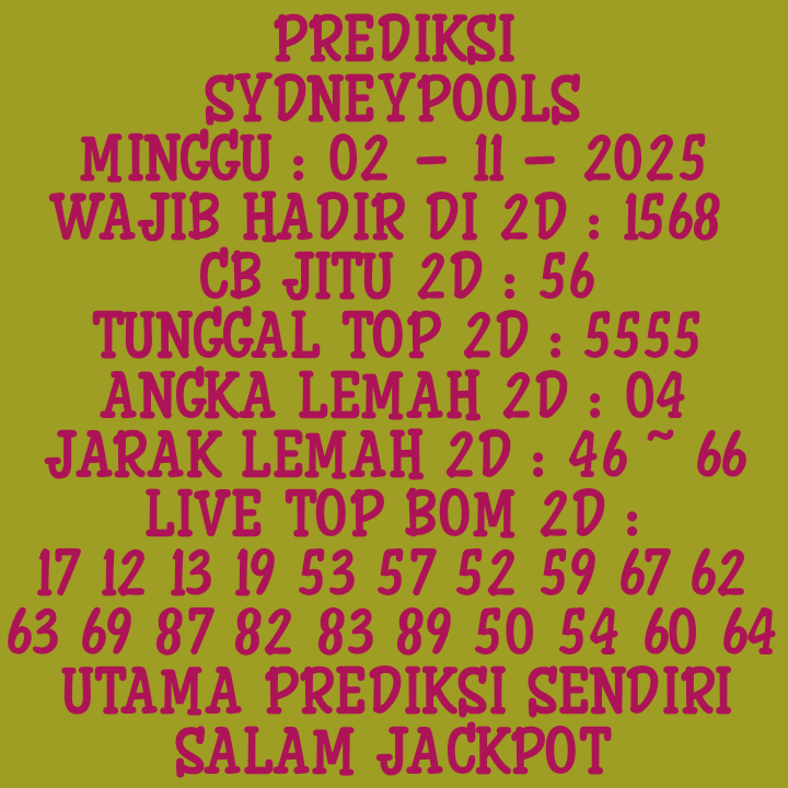 Prediksi Sydneypools Jumat, 16-01-2026 Merupakan Prediksi Otomatis yang menggabungkan Metode Kalender Togel Dengan LN Generator yang akurasi prediksinya sudah kita ketahui bersama. Jadi harap Maklum Jika kadang meleset Prediksi Sydneypools kita. Jadikan ini sebagai perbandingan saja dan tetap Utamakan karya sendiri