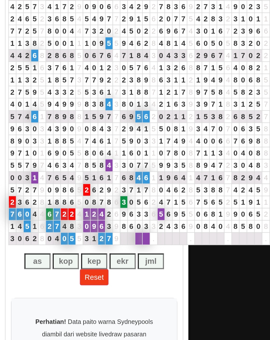 | Rumus Angka Mati berdasarkan kepala harian | 07 08 09 10 19 20 21 27 28 31 38 39 40 41 42 43 48 49 50 51 52 53 54 59 60 61 62 63 65 71 73 74 76 85 86 87 96 97 98 |