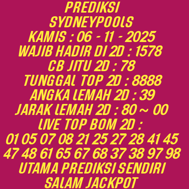 Prediksi Sydneypools Jumat, 16-01-2026 Merupakan Prediksi Otomatis yang menggabungkan Metode Kalender Togel Dengan LN Generator yang akurasi prediksinya sudah kita ketahui bersama. Jadi harap Maklum Jika kadang meleset Prediksi Sydneypools kita. Jadikan ini sebagai perbandingan saja dan tetap Utamakan karya sendiri