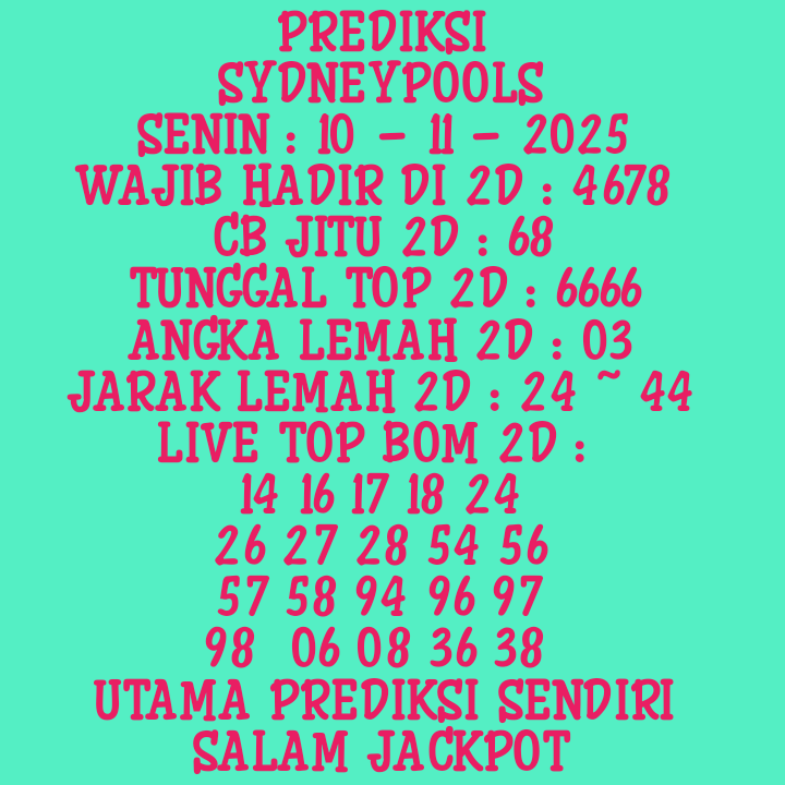 Prediksi Sydneypools Selasa, 23-12-2025 Merupakan Prediksi Otomatis yang menggabungkan Metode Kalender Togel Dengan LN Generator yang akurasi prediksinya sudah kita ketahui bersama. Jadi harap Maklum Jika kadang meleset Prediksi Sydneypools kita. Jadikan ini sebagai perbandingan saja dan tetap Utamakan karya sendiri