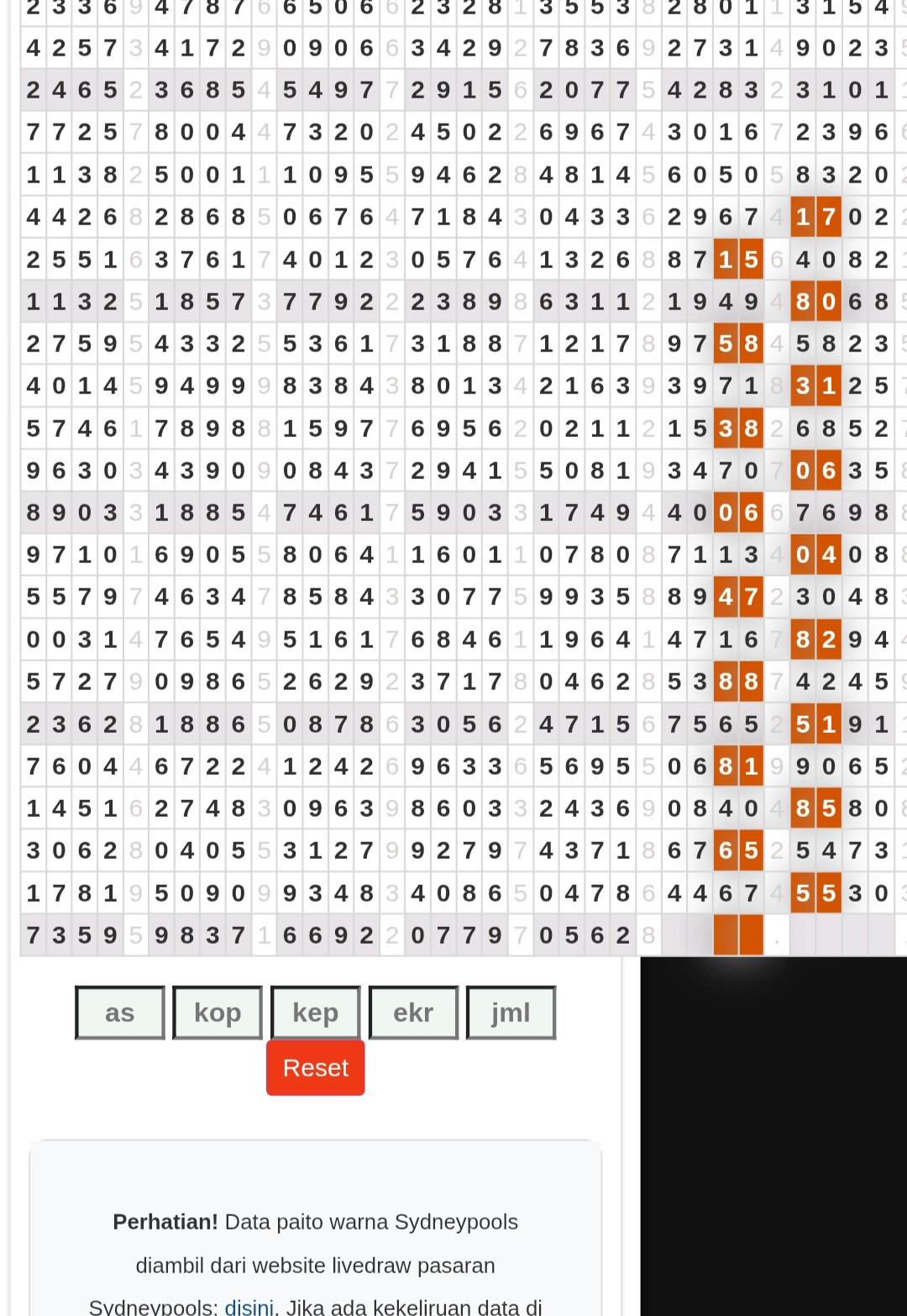 | Rumus Angka Mati berdasarkan kepala harian | 05 06 08 09 16 17 19 20 21 26 27 28 29 30 31 32 37 38 39 40 41 43 48 49 51 52 54 59 63 64 65 74 75 76 85 86 87 97 98 |