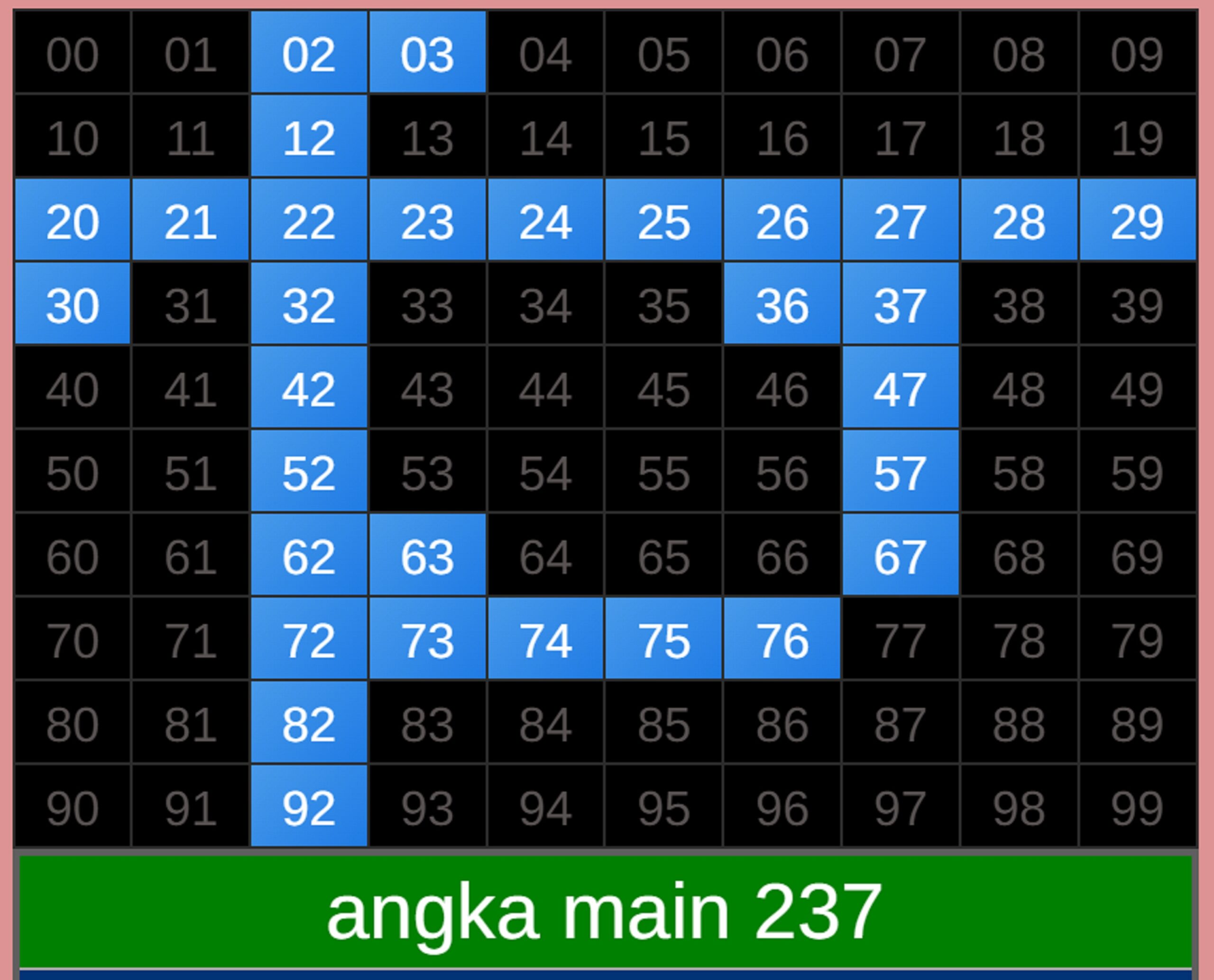 | Rumus Angka Mati berdasarkan kepala harian | 04 05 06 07 08 09 10 15 16 17 18 19 21 26 27 28 29 30 32 37 39 41 42 43 52 53 54 63 64 65 75 76 83 84 86 87 94 95 97 |