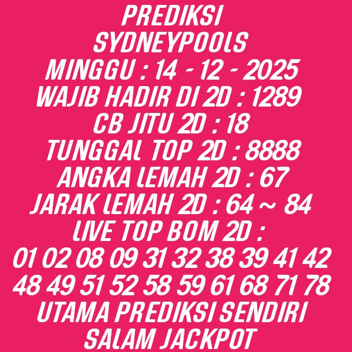 Prediksi Sydneypools Senin, 22-12-2025 Merupakan Prediksi Otomatis yang menggabungkan Metode Kalender Togel Dengan LN Generator yang akurasi prediksinya sudah kita ketahui bersama. Jadi harap Maklum Jika kadang meleset Prediksi Sydneypools kita. Jadikan ini sebagai perbandingan saja dan tetap Utamakan karya sendiri