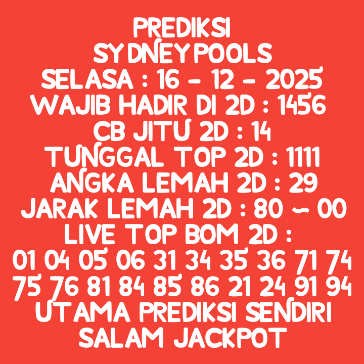 Prediksi Sydneypools Jumat, 26-12-2025 Merupakan Prediksi Otomatis yang menggabungkan Metode Kalender Togel Dengan LN Generator yang akurasi prediksinya sudah kita ketahui bersama. Jadi harap Maklum Jika kadang meleset Prediksi Sydneypools kita. Jadikan ini sebagai perbandingan saja dan tetap Utamakan karya sendiri