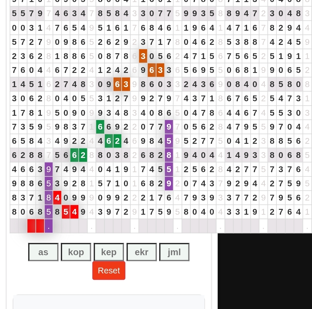 | Rumus Angka Mati berdasarkan kepala harian | 04 05 06 07 08 09 10 15 16 17 18 19 21 26 27 28 29 30 32 37 39 41 42 43 52 53 54 63 64 65 75 76 83 84 86 87 94 95 97 |