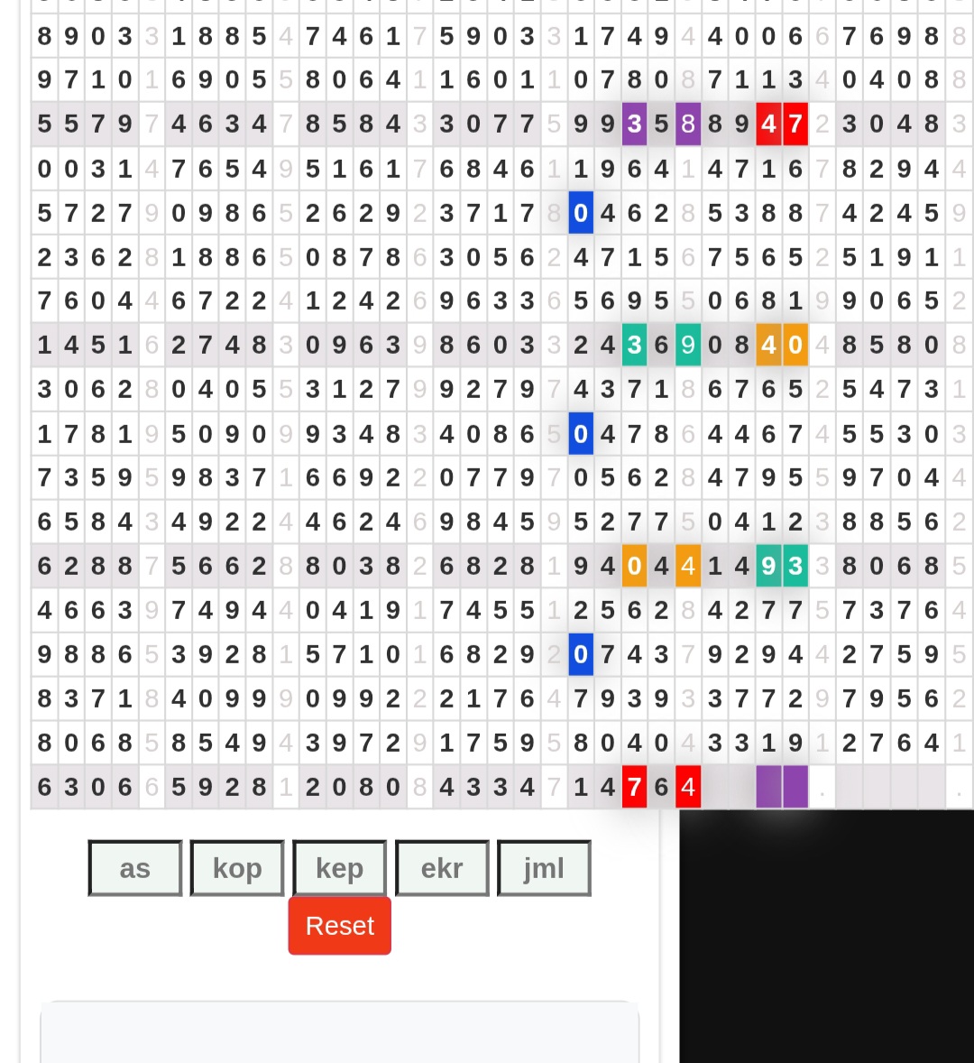 | Rumus Angka Mati berdasarkan kepala harian | 04 05 06 07 08 09 10 15 16 17 18 21 26 28 29 30 31 32 41 42 43 52 53 54 64 65 72 73 75 76 83 84 86 93 94 95 96 97 98 |