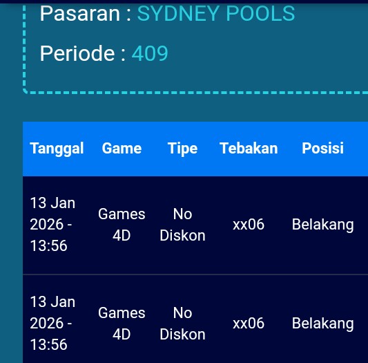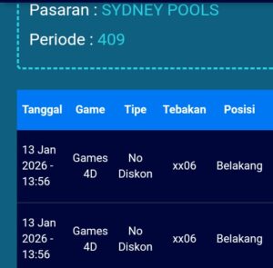 Prediksi Sydneypools Selasa, 13-01-2026 Merupakan Prediksi Otomatis yang menggabungkan Metode Kalender Togel Dengan LN Generator yang akurasi prediksinya sudah kita ketahui bersama. Jadi harap Maklum Jika kadang meleset Prediksi Sydneypools kita. Jadikan ini sebagai perbandingan saja dan tetap Utamakan karya sendiri