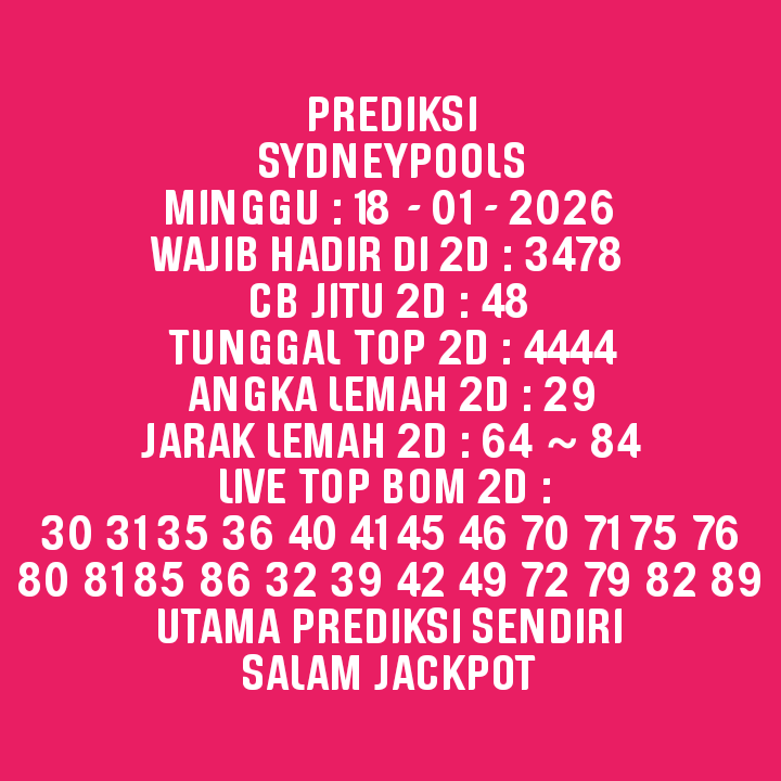 Prediksi Sydneypools Jumat, 09-01-2026 Merupakan Prediksi Otomatis yang menggabungkan Metode Kalender Togel Dengan LN Generator yang akurasi prediksinya sudah kita ketahui bersama. Jadi harap Maklum Jika kadang meleset Prediksi Sydneypools kita. Jadikan ini sebagai perbandingan saja dan tetap Utamakan karya sendiri