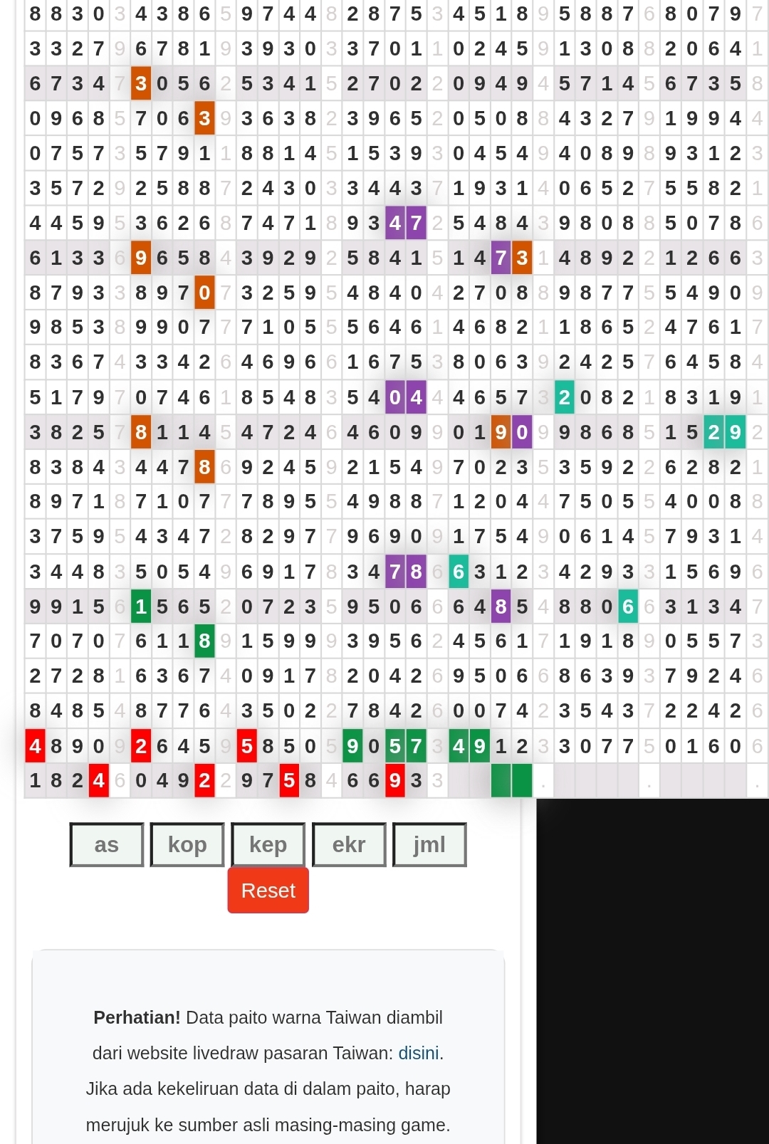 | Rumus Angka Mati berdasarkan kepala harian | 08 09 10 16 17 19 20 27 28 30 31 32 37 38 39 40 41 42 43 48 49 50 51 52 54 59 60 62 63 65 74 75 76 85 86 87 96 97 98 |