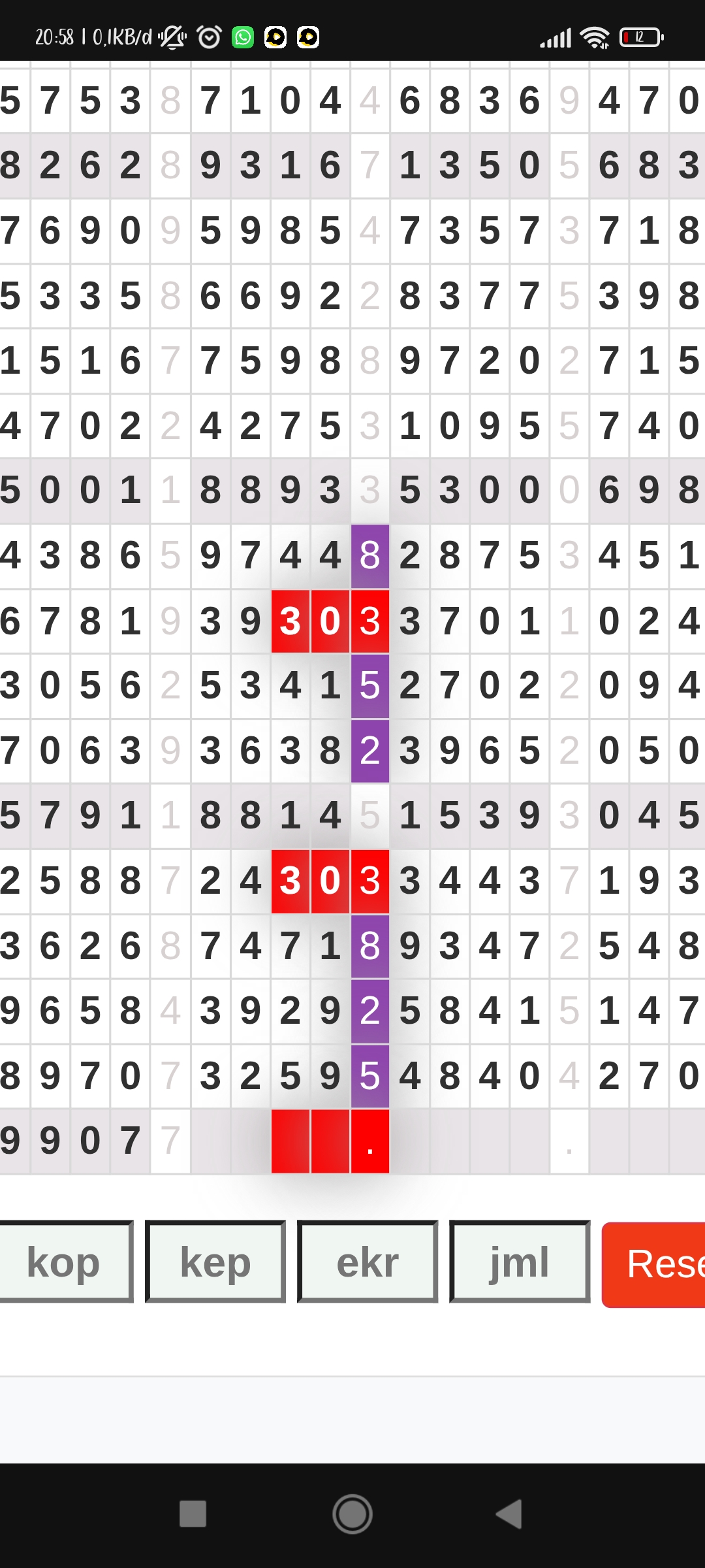 | Rumus Angka Mati berdasarkan kepala harian | 08 09 10 16 17 19 20 27 28 30 31 32 37 38 39 40 41 42 43 48 49 50 51 52 54 59 60 62 63 65 74 75 76 85 86 87 96 97 98 |