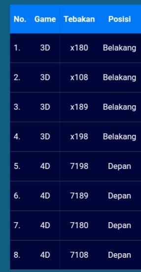 | Rumus Angka Mati berdasarkan kepala harian | 04 05 06 07 09 10 15 17 18 20 21 29 30 31 32 41 42 43 53 54 61 62 64 65 72 73 75 82 83 84 85 86 87 93 94 95 96 97 98 |